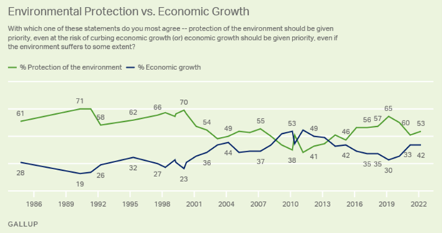 When asked whether environmental protection should be prioritized over economic growth, 53 percent said yes, while 42 percent favored a focus on economic growth. And when asked if the environment should be protected even at the cost of limiting US production of oil, gas, coal, and other energy, half of respondents in 2022 said yes, compared to 46 percent who thought energy development should be the priority. Meanwhile, a slight majority (54 percent) worry a fair amount or a great deal about urban sprawl and loss of open spaces. These data suggest some openness to downgrading the importance of economic growth.