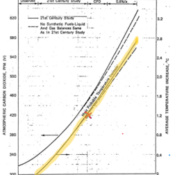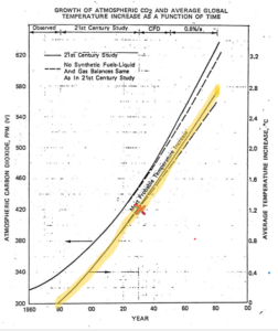 In 1982 Exxon predicted that the atmospheric concentration of CO2 could rise to double its preindustrial level, pushing global temperatures higher. Indeed, the “Most Probable Temperature Increase” chart taken from a 1982 internal Exxon memo projected rising average global temperatures (the highlighted line in the chart) based on expected increases in atmospheric concentrations of CO2—partly, of course, from burning Exxon products. Lo and behold, in 2023 concentrations of CO2 and the temperature increase over preindustrial times track closely with the 1982 Exxon projections (the red X in the chart).